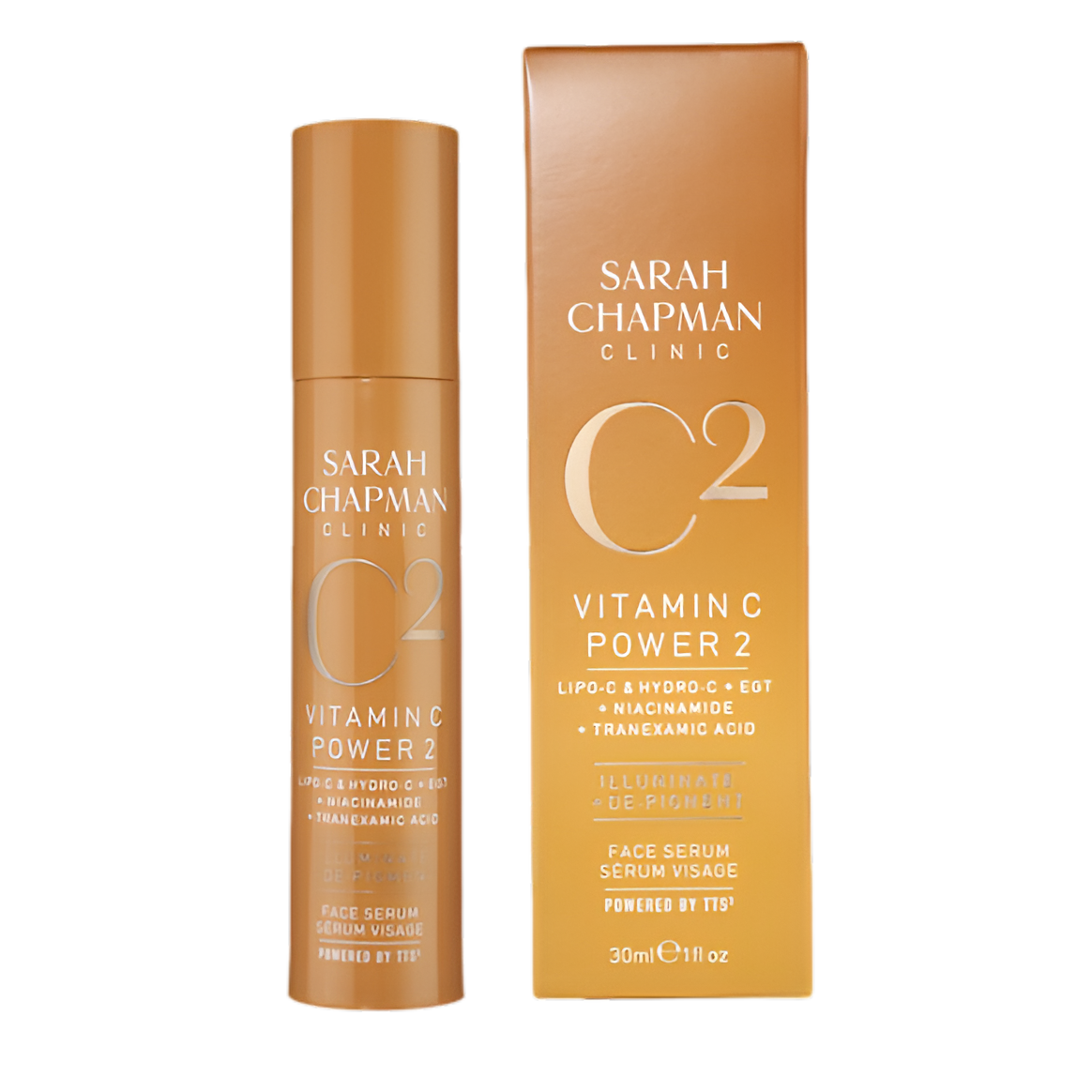 Sérum Vitamin C Power 2 de Sarah Chapman: doble vitamina C + niacinamida + ácido tranexámico para iluminar, unificar tono, mejorar textura y proteger la piel.